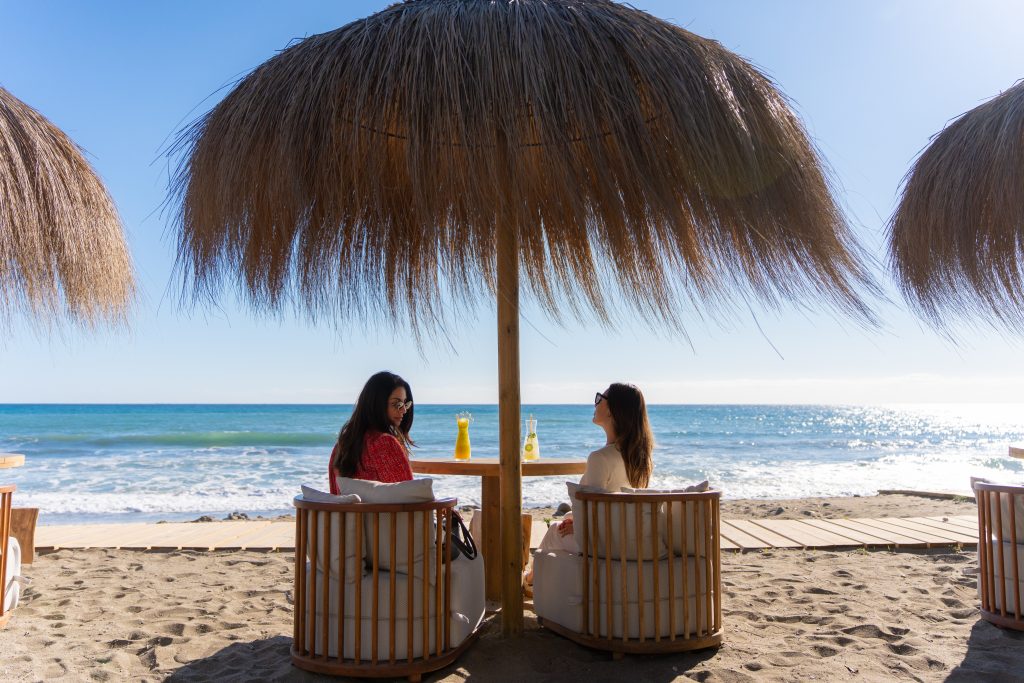 Un buen comienzo es junto al mar, donde la luz es más suave y el ritmo del pueblo se siente más tranquilo. Malva Beach se encuentra en la entrada este de Estepona, justo en la Playa de la Rada. El mar se abre en silencio hacia Gibraltar, la arena está cálida bajo los pies y el ambiente combina texturas naturales con un toque boho chic.
